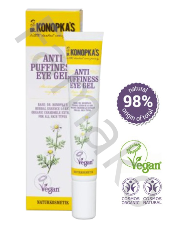 Obnovující oční gel obsahuje speciální bylinnou esenci Dr. Konopky č. 54. Tato esence obsahuje vitamíny a minerální látky, které jsou důležité pro výživu a obnovu jemné pokožky kolem očí. Organický extrakt heřmánku pomáhá zmírnit otoky a tmavé kruhy pod očima. Činí pohled více odpočatý a zářivý.