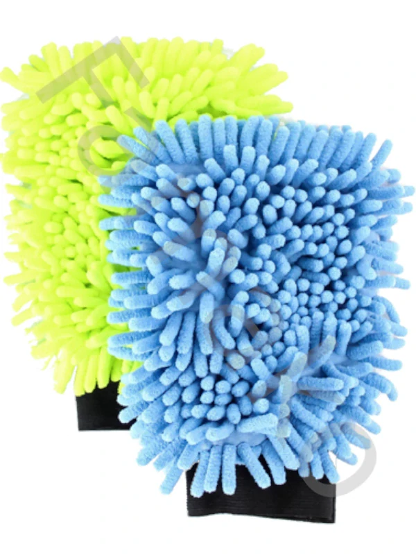 Čisticí rukavice 2 v 1 na jedné straně s hadříkem z mikrovlákna např. pro čištění skla bez šmouh a na druhé straně vločkovaná (žinylka), hmotnost: 45 g, Rozměr rukavice: 16 x 22 cm. ve 2 různých barvách - mix barev v krabičce (neonově žlutá, modrá)